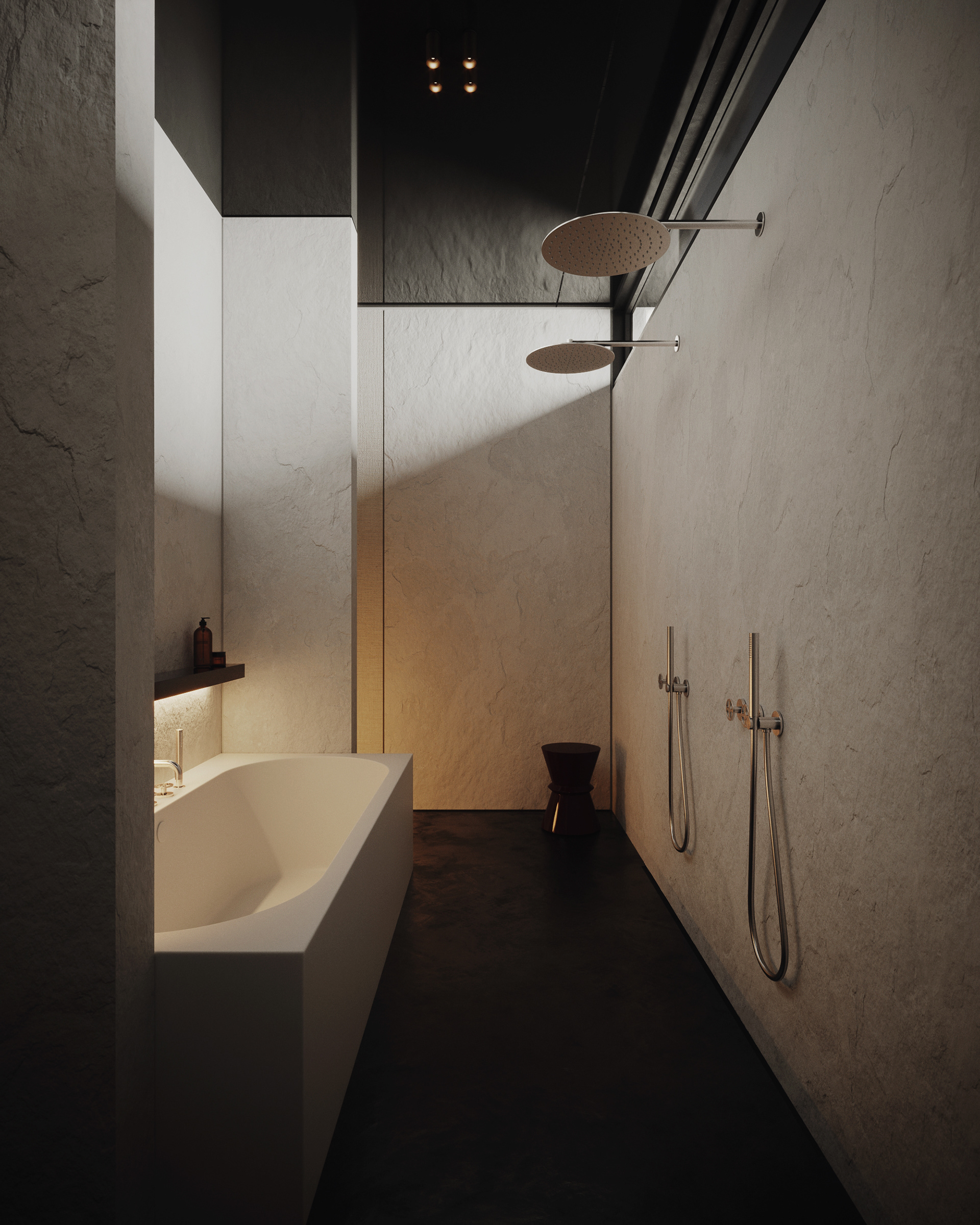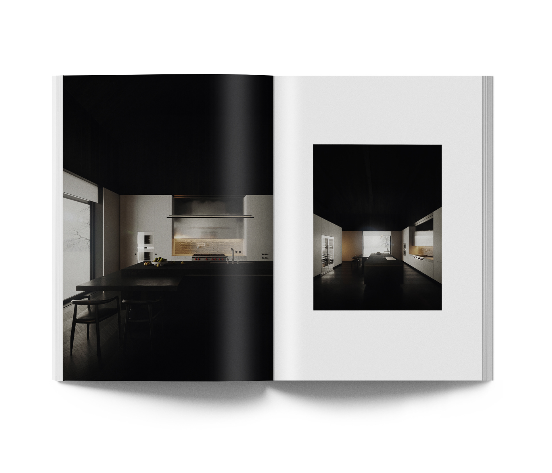 The interior is finished with warm and natural material like wood, brass, leather, linen and has some dark red lacquered accents in each room. It also incorporates the white brick to connect the interior with the exterior. Dark wood floor gives a lot of visual contrast along with the neutral white walls. And the black ceiling almost creates a feeling of endless void above your head.